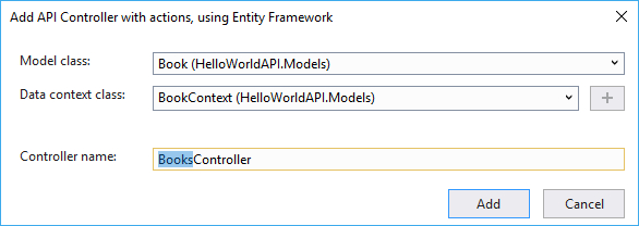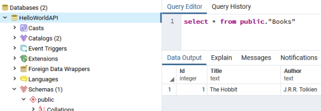 using System.ComponentModel.DataAnnotations; namespace HelloWorldAPI.Models { public class Book { [Key] public int Id { get; set; } public string Title { get; set; } public string Author { get; set; } } }(Please note: In an actual real word, non-Hello World API, a DTO(s) would be used here. Using an entity for a view model is brittle...Having said that, it has the advantage of keeping this article small, and quickly getting to the PostgreSQL part.)