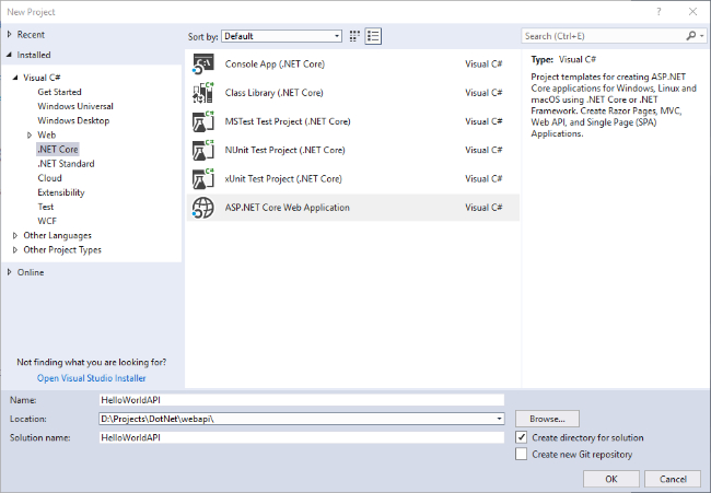In Visual Studio 2017, create a new ASP.NET Core Web Application project, HelloWorldAPI