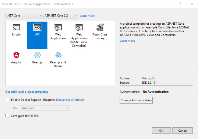 Step 2. Select the API project template, uncheck the Configure HTTPS checkbox, and make sure ASP.NET 2.2 Core is selected.